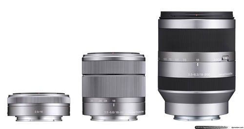 به علاوه سه نوع لنز E-mount وجود دارد: لنز 16 میلی متری با 2.8  Fکه میدان دید 24 میلی متری را نشان می دهد, لنز استاندارد 55 – 18 میلی متری F3.5-5.6 با زوم ثابت و لنز یک 20-18 میلی متری با سوپرزوم F3.5-6.3.